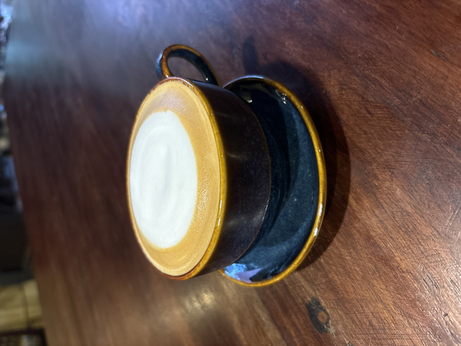 - "A dark blue ceramic cup with a mustard yellow rim, containing a foamed coffee beverage, rests on a matching saucer on a dark brown wooden table" by FM-bmo3E3, licensed under CC BY 4.0