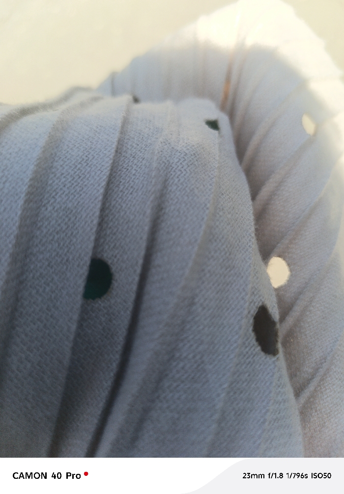 The image depicts a close-up, out-of-focus view of a light-colored, possibly off-white or light grey, pleated fabric. The fabric exhibits a visible woven texture and is adorned with multiple circular markings, appearing as polka dots, in varying shades of dark green, dark brown/black, and one bright white. The pleats run vertically across the frame, creating distinct lines and shadows. A strong, bright light source, likely natural light, originates from the upper right, causing parts of the fabric to appear overexposed and casting soft highlights. The background is completely blurred due to a shallow depth of field. No individuals are present. No specific actions or interactions are depicted. The environment is limited to the fabric and ambient light conditions. The image is stated to be from Nakuru East ward, Nakuru City, Kenya. Camera metadata "CAMON 40 Pro" and "23mm f/1.8 1/796s ISO50" are visible at the bottom.