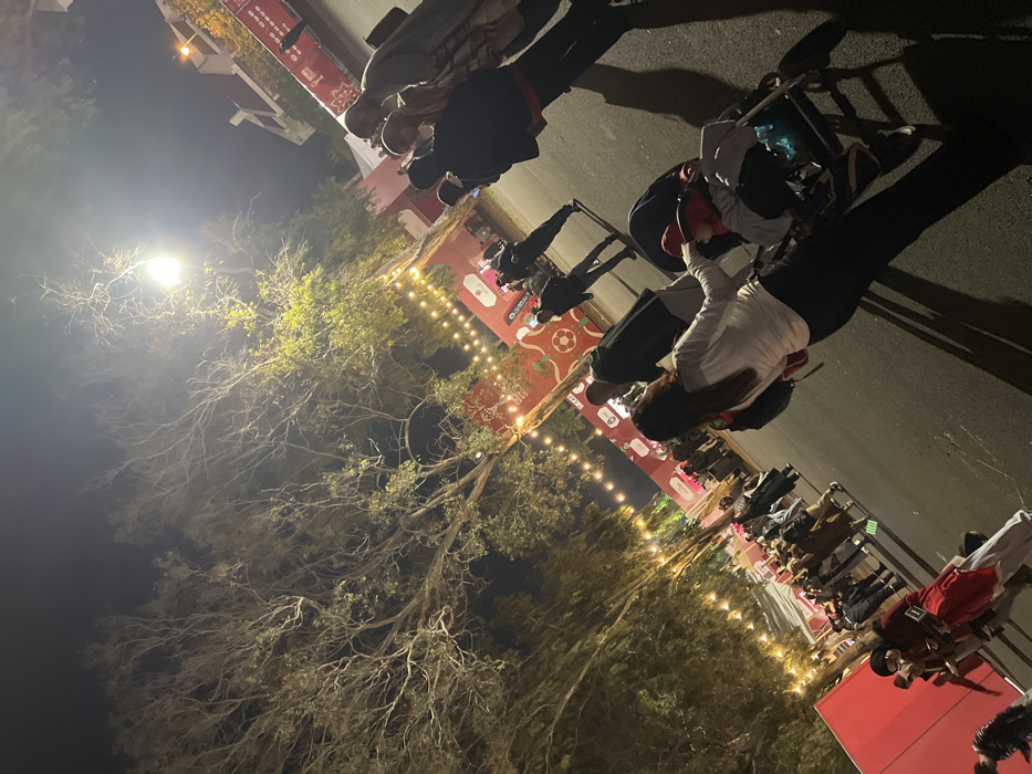 At night, people gather near a decorated area with string lights, trees, and a lit-up banner. Some are standing, while others are seated, with shadows indicating movement. The scene is illuminated by a bright street light.