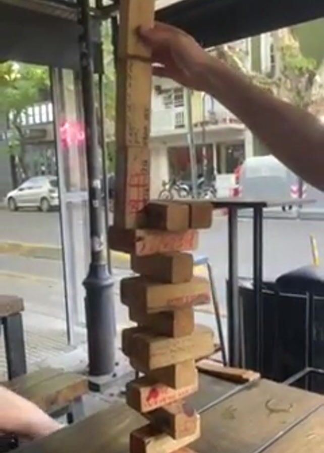 A person is trying to balance a tower of wooden blocks on a table. The tower is tall and wobbly, and the person is using their hand to keep it from falling. The blocks are inscribed with writing and symbols. The table is on a patio, and there is a street in the background. A second person sits at the table with the player.
