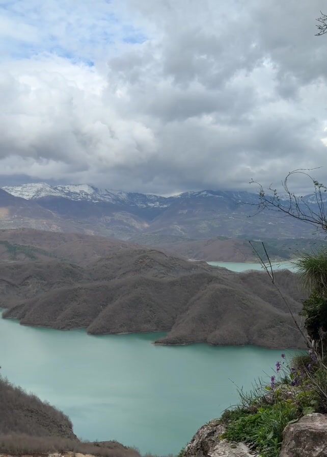 scenic view of a lake surrounded by mountains under a cloudy sky. The lake has a light blue hue, and the mountains are mostly brown with patches of green. Some of the mountain peaks are covered in snow. A dirt road winds down one of the hillsides toward the lake. The camera is positioned from a high vantage point, looking down at the landscape. The foreground includes rocks and some vegetation, including a few purple flowers.