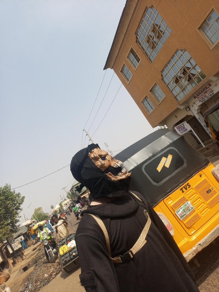 An individual wearing a black balaclava with a detailed, light-brown skeletal or demonic mask affixed to the front stands in a street scene in Pantame, Nigeria
