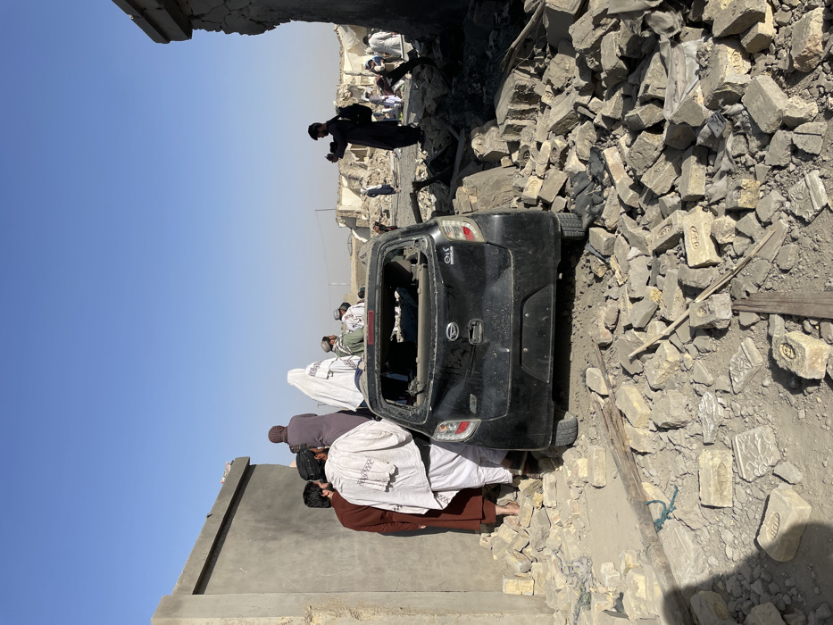 The image captures a scene of urban destruction in Spin Boldak, Afghanistan, under a clear blue sky. A black, heavily damaged subcompact car, with its rear windshield missing and significant body deformation, is centrally positioned amidst extensive rubble. The ground is covered with broken bricks, concrete fragments, and debris from collapsed structures. On the immediate left, a group of four individuals stands near a partially damaged concrete wall. This group includes a man in a reddish-brown garment, another man in a white shalwar kameez with a white cloth draped over his shoulder, a person in a dark brown garment with a head covering, and another person in a white garment with a head covering. They appear to be observing the damaged area. To the right of the damaged car, a man dressed in dark clothing and carrying a backpack stands on a pile of rubble, holding a smartphone horizontally, seemingly capturing images or video of the scene. In the background, numerous other individuals are scattered across a landscape of severely damaged and collapsed buildings, reduced largely to foundations and debris. On the far right, a heavily damaged stone or concrete wall structure is visible.