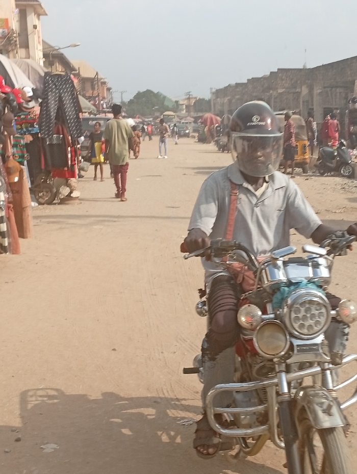 This image depicts a bustling street scene in Nnobi, Nigeria, under bright, hazy daylight. The ground is unpaved, consisting of light brown dirt. In the immediate foreground, a dark-skinned male operates a motorcycle, facing directly towards the viewer. He wears a light grey short-sleeved collared shirt, dark trousers, and dark sandals. An orange strap is visible across his left shoulder. He wears a dark-colored helmet with a clear visor, bearing the inscription "EVANSTONE." His hands grip the handlebars. The motorcycle is dark-colored with extensive chrome accents on the handlebars, engine guard, and front fender. It features two prominent front lights: a circular standard headlight and an adjacent multi-LED circular headlight array. Shadows from the motorcycle and rider are cast on the ground to the left. To the left of the street, market stalls are visible under awnings, displaying various merchandise including garments; a pair of dark trousers with a white geometric pattern is hanging prominently. Several pedestrians are scattered along the dusty street. One individual, seen from behind in the midground, wears a light olive green top and dark red trousers, walking away from the camera. Further down the street, other individuals and vehicles are discernible, including a person in a yellow top and dark skirt to the left. The background features buildings lining both sides of the street. On the right, structures appear to be older, possibly brick or concrete, with flat or low-pitched roofs. More distant structures and green foliage are visible under the hazy sky, indicating the extent of the urban environment.