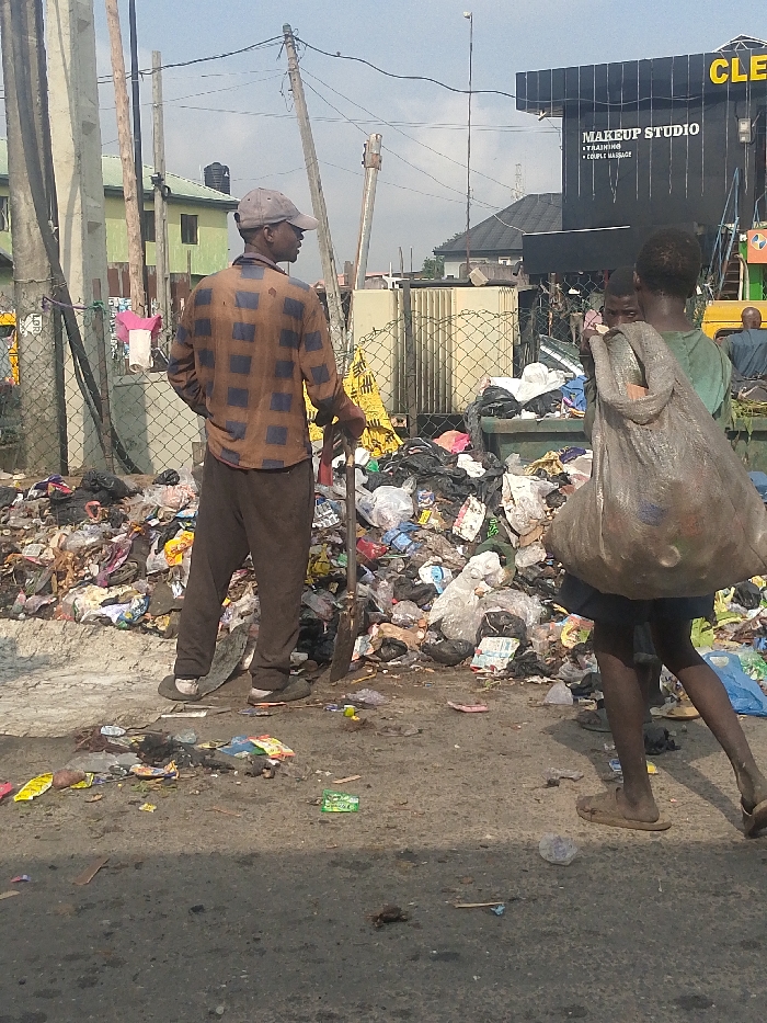 The scene depicts an urban street in Lagos, Nigeria, characterized by visible environmental pollution