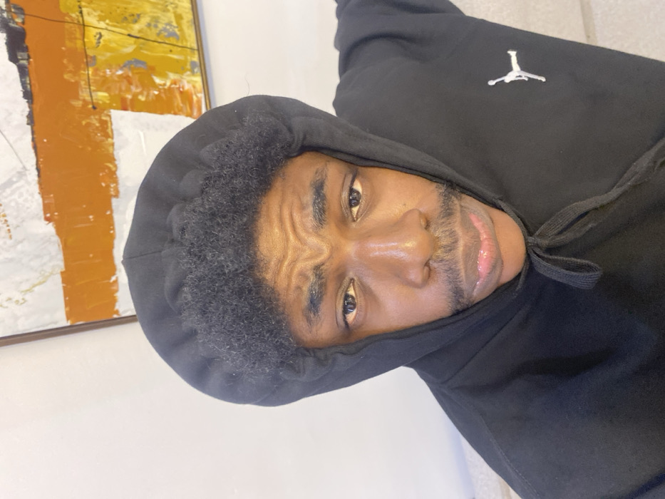 The image depicts a close-up, slightly high-angle portrait of a single individual, identified as male, situated indoors in Igboefon, Nigeria. The individual has a dark complexion, appears to be a young adult, and wears a black hooded sweatshirt with the hood pulled up, partially obscuring the forehead but revealing short, dark, textured hair along the hairline. A thin mustache is visible above the lips, which are slightly parted and appear glossy. The eyebrows are subtly furrowed, suggesting a neutral or mildly pensive expression, and the eyes are dark, looking directly forward into the camera lens. A white "Jumpman" logo (Air Jordan) is visible on the left chest area of the black hoodie. The background consists of a plain, light-colored wall. To the upper right, a framed abstract painting is visible, featuring dominant horizontal and vertical strokes of orange, yellow, black, and white paint. The scene is evenly lit, indicating an indoor setting.