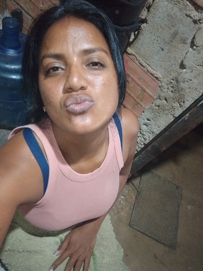 A woman poses for a selfie, puckering her lips. She wears a light pink tank top with visible dark blue bra straps. A large blue water jug is partially visible in the background. The setting appears to be a rustic or unfinished indoor space, with textured brick walls and a dark, possibly metallic, object in the top right corner. A metal grate lies on the floor. Her nails are painted white.