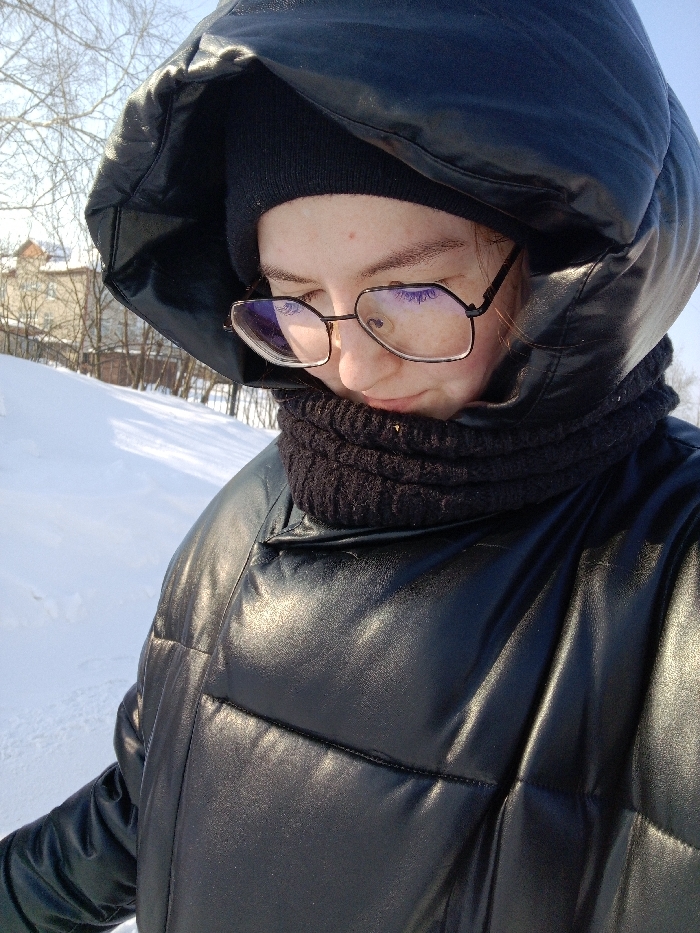 An individual is captured outdoors in a snowy environment in the city of Kuyeda, Russia. The subject, appearing to be an adult, wears a black quilted puffy jacket with a prominent hood pulled over a black beanie. A black knitted neck warmer or snood is wrapped around the neck, obscuring part of the lower face. The individual wears dark-framed, hexagonal eyeglasses, reflecting a bright, clear sky. The subject's head is tilted downwards and slightly to the right, with the gaze directed towards the lower frame. The foreground consists of untouched white snow. In the background, sparse, bare trees are visible, with light-colored buildings and a clear blue sky beyond, illuminated by strong sunlight.