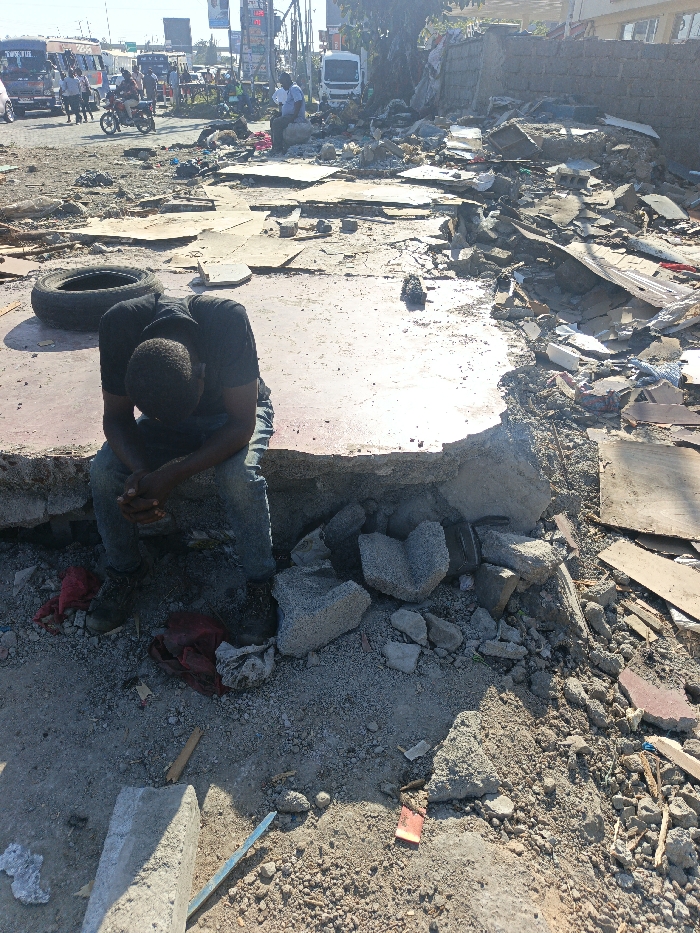 The image depicts an urban demolition site under bright sunlight, situated adjacent to a busy main road in Nairobi, Kenya. In the immediate foreground, a dark-skinned male, dressed in a black t-shirt, blue jeans, and dark work boots, is seated on a fractured concrete slab. He is hunched over, with his head bowed and hands clasped between his knees. To his left on the same slab, a black rubber tire rests. The ground surrounding the slab and extending into the midground is covered extensively with demolition debris, including broken concrete blocks, rebar, gravel, dirt, wooden planks, and miscellaneous refuse. A crumpled red fabric item lies near the seated man's feet. In the mid-distance, another male figure in a light-colored shirt is seated on a pile of debris, observed near a white truck and a grey concrete block wall bordering the scene on the right. The background features an active multi-lane road with a diverse flow of traffic, including a large public transport bus (matatu), a motorcycle, and several pedestrians. Utility poles with overhead lines and a large advertising billboard displaying text and numbers, including '173', are visible along the road. The sky is clear.