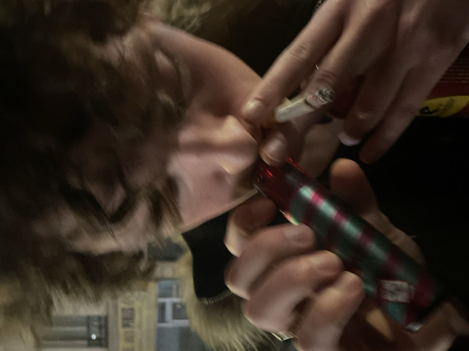 A person with light skin is seen smoking a cigarette. Another person is lighting it with a red and teal striped lighter. The lighting is dim. The person smoking is wearing a dark-colored jacket with a furry collar. A building with windows is visible in the blurred background. The angle is tilted, possibly taken from a low vantage point.