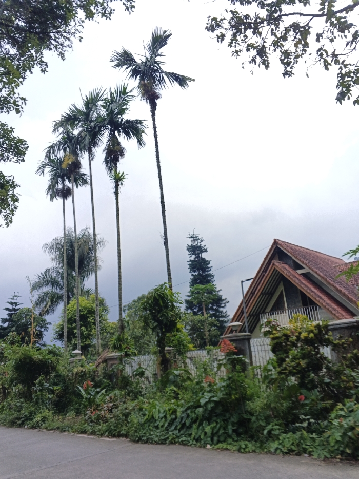 This image captures a static outdoor scene in Vang Vieng, Laos, under an overcast sky. In the foreground, a gray asphalt road occupies the lower left portion of the frame. Adjacent to the road, a dense and overgrown strip of tropical vegetation, featuring ferns, various bushes, and flowering plants with red and orange blossoms, stretches across the bottom and mid-sections. Partially obscured by this foliage, a light-colored metal fence runs horizontally through the midground. Behind the vegetation and fence, a prominent residential structure is visible on the right, characterized by its multi-gabled, reddish-brown tiled roof and light-colored walls, which include a small balcony area. Five exceptionally tall and slender palm trees, likely Areca catechu (betel nut palms), with green fronds and visible fruit clusters, stand vertically on the left side of the midground, silhouetted against the sky. Additional varied tree species, including taller conifers and broad-leaved trees, populate the midground and background. The sky is uniformly gray and overcast, suggesting subdued lighting. No individuals or animals are present within the frame.
