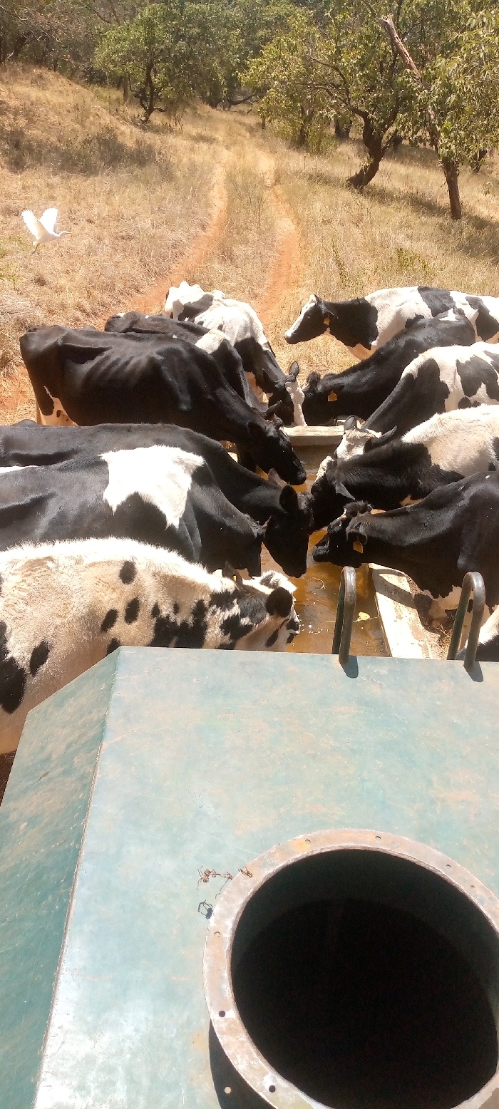 A herd of black and white cows drinks from a rectangular trough. A large, cylindrical metal structure dominates the foreground, partially obstructing the view. A dirt path leads into the background, where sparse trees and dry grass cover the land. A white bird flies to the left in the distance.