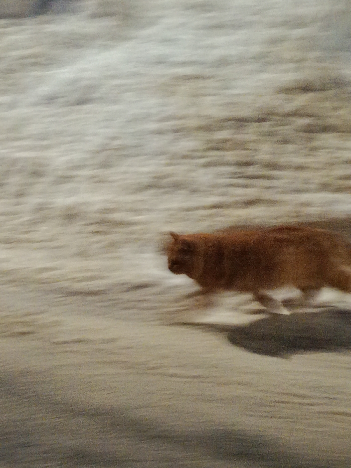 The location is undetermined within the city of Unknown, Unknown. The image displays a scene with significant horizontal motion blur, primarily depicting a solitary orange (ginger) domestic cat in mid-stride, proceeding from left to right across the lower-center of the frame. The cat's body is distinctly visible in profile, with its four legs extended in a running or walking motion, casting a subtle shadow below. Its head is slightly blurred, indicating movement. The ground surface beneath the cat is textured and appears light-toned, possibly concrete or dirt, but is indistinct due to the motion blur. The background and foreground are entirely obscured by horizontal streaking, providing no identifiable objects or environmental features beyond the immediate ground plane. No individuals are present, and no interactions are observable within the scene.