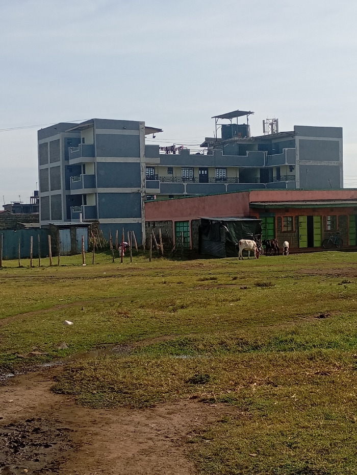 A gray building with multiple floors dominates the landscape. The structure has a flat roof with equipment and hanging laundry. In the foreground is a field, with cows grazing near a small, run-down building with corrugated metal and green trim. A bicycle leans against the building. A fence runs along the left side of the field. The ground is partially muddy. The sky is clear and pale.