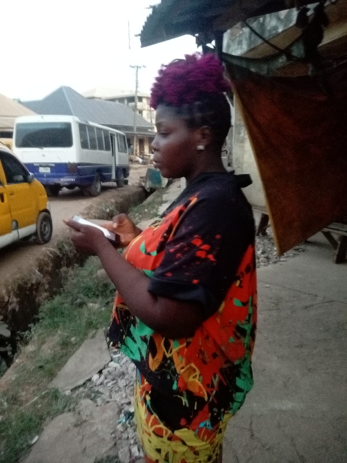 A woman stands in a street scene, her side profile visible as she looks to the left and holds a phone in her hands. She has dark skin and a distinctive purple, textured hairstyle. She wears a colorful patterned top and skirt. A yellow taxi cab is parked on the left, while a white minibus is further back. The setting appears urban, with buildings, streets, and drains visible in the background. A makeshift shelter or stall structure is partially seen to the right.
