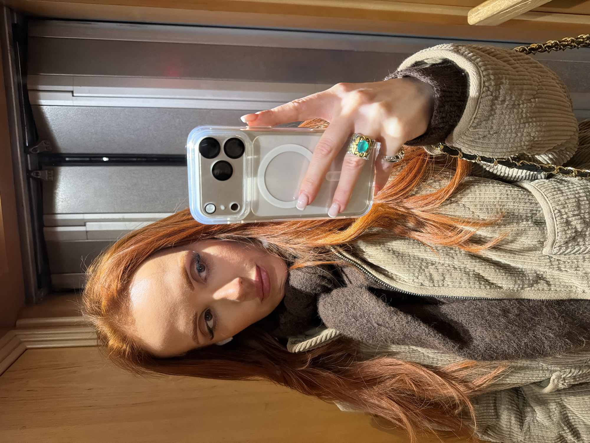 A red-haired woman holds her iPhone up at eye-level, pointed at the camera. The phone has a transparent case and three camera lenses. Her right hand holds the phone with her index finger on the screen. She is wearing two ornate rings on her right ring finger. She's wearing a beige jacket, a scarf, and a brown sweater, with a black and gold chain. She is indoors in a well-lit space. Behind her is a light-colored wooden doorframe and what appears to be a light-colored blind. There is no information to suggest this picture was taken in Paris.