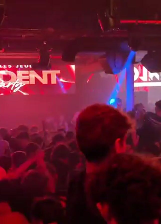 The video captures a lively scene inside a nightclub, teeming with a dense crowd of people, presumably students