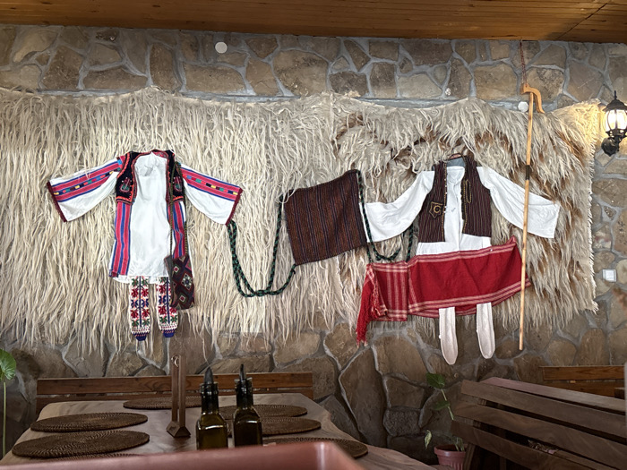 An indoor scene in Balgarski Izvor, Bulgaria, displays two sets of traditional Bulgarian folk costumes mounted against a wall