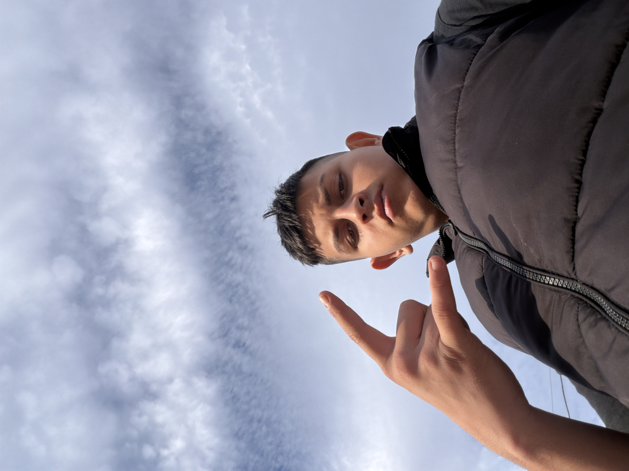 A low-angle shot depicts a young man outdoors against a sky filled with scattered clouds. The man is partially framed from the chest up. He is wearing a black, puffy jacket with a visible zipper. His hair is short and dark. The man's right arm is extended towards the viewer, with the index finger pointed upwards. The location is Dolni Dabnik, Bulgaria.