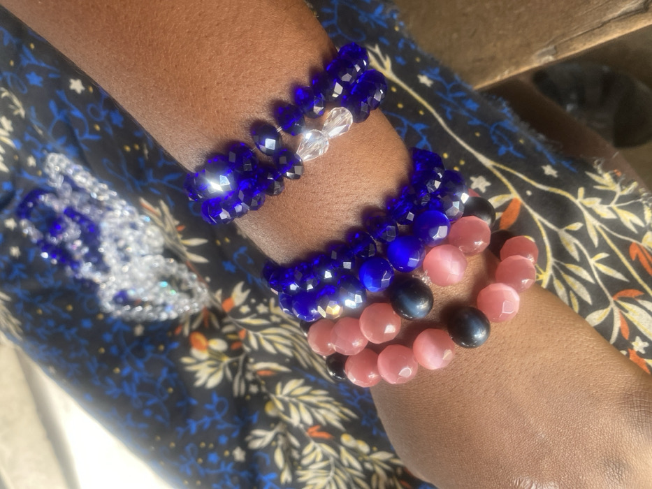The image depicts a close-up view of a human forearm, displaying dark skin, located in Moniya, Nigeria. The arm is adorned with several beaded bracelets. Multiple strands of faceted royal blue beads are visible, one featuring a central cluster of clear faceted beads. Adjacent to these are multiple strands of smooth, spherical beads in a pale pink hue, interspersed with larger, dark grey or black spherical beads. The arm is positioned against a dark fabric, patterned with blue, white, yellow, orange, and light green stylized foliage. The background, out of focus, shows blurred white and blue beads, and a segment of a light brown, possibly wooden, surface on the right. Bright illumination creates highlights on the faceted beads.