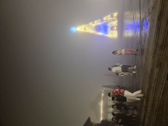 The image depicts a nighttime outdoor scene characterized by dense fog, located in Bà Nà Hills, Đà Nẵng, Vietnam. A large, conical structure, illuminated with numerous yellow string lights and accented with blue lights forming a pattern, stands prominently on the right, topped with a blue star. This structure, appearing to be a Christmas tree, reflects on the wet, dark paved surface of the ground. Approximately 10-15 individuals, primarily adults, are dispersed across the paved area. In the mid-left, a male subject in a red and white patterned long-sleeved shirt and white pants is observed interacting with another subject in darker clothing. Other individuals are seen walking or standing, dressed in casual attire, their forms partially obscured by the fog. A building with illuminated windows or archways is partially visible on the far left, also shrouded in the heavy mist. The ground in the foreground shows linear patterns, possibly tracks or decorative elements, and appears uniformly wet and reflective.