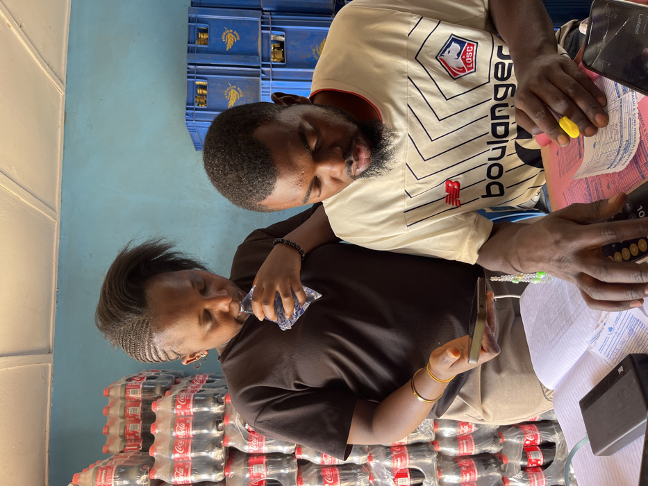An indoor scene in Jos, Nigeria, features two individuals engaged in administrative tasks, surrounded by commercial beverage stock