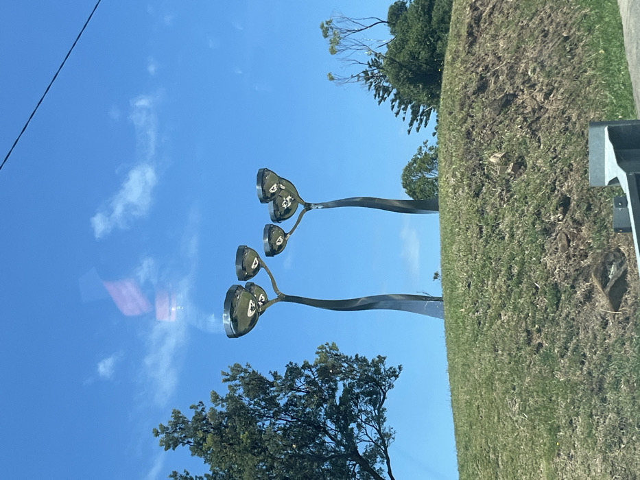 A low-angle shot reveals two metal sculptures resembling large spoons with rounded bowls. Each sculpture sprouts three "bowls," reflecting the blue sky and foliage. The sculptures are set against a backdrop of a grassy hill dotted with trees. A clear blue sky with scattered clouds fills the upper portion of the frame. A utility wire stretches across the upper left corner.