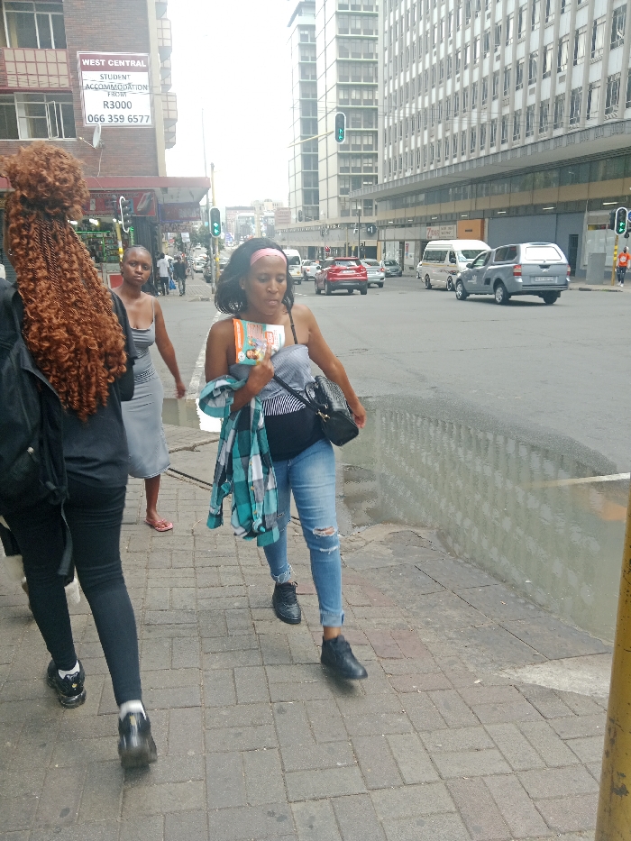The image displays an urban street scene in the city center of Johannesburg, South Africa, near a building identified by a "WEST CENTRAL STUDENT ACCOMMODATION" sign. Three individuals are walking on a paved sidewalk. In the immediate foreground, a person, viewed from behind, wears black leggings/trousers, black shoes with white socks, and a black backpack. Their hair is voluminous, reddish-brown, and tightly coiled. To their right, a female with very short, dark hair, wearing a grey and white striped sleeveless dress and pink flip-flops, walks forward with her gaze directed slightly right of the camera. In the mid-ground, a female wearing a pink headband, a black strap top over a horizontal black and white striped garment, light blue ripped jeans with visible tears, and dark ankle-high boots, walks toward the viewer's right. She holds a colorful book or magazine and a folded blue and green plaid shirt in her right hand, while a black shoulder bag hangs from her left shoulder. Her mouth is slightly open. The sidewalk is paved with rectangular grey pavers and exhibits several puddles of standing water along the curb, suggesting wet conditions. The adjacent asphalt road features active vehicular traffic, including a silver SUV with a rear canopy, a white passenger van, and a red sedan, all operating under green traffic signals visible at an intersection. Tall, multi-story commercial or residential buildings with numerous windows line the street, forming the backdrop of the scene under an overcast sky.