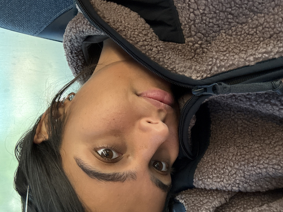 A close-up image depicts a young adult female from the chest up, leaning to her left, with her head resting on what appears to be a dark upholstered seat or headrest. She has dark hair, brown eyes, and a light to medium skin tone, with a neutral expression as she looks directly towards the camera. She is wearing a textured brown or tan fleece jacket with a visible black collar and a partially unzipped black zipper. Small, reflective earrings are visible on her left ear. The background is blurred, displaying a light blue-green hue, possibly indicating a window or interior lighting. The specific location within Linden, United States, cannot be determined from the visual information provided in the image.