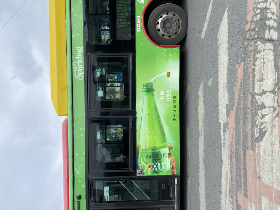 - "A bus displays an advertisement for SPRITZER Sparkling water, featuring a green bottle pouring water" by FM-y52303, licensed under CC BY 4.0