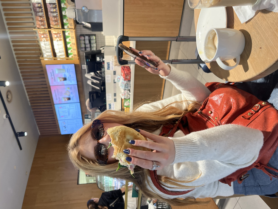 A blonde-haired individual, wearing dark oval sunglasses, a white long-sleeved sweater, and blue jeans, is seated at a round wooden table inside a modern cafe or eatery. The location is an airport terminal in Tremblay-en-France, specifically consistent with Charles de Gaulle Airport (CDG), indicated by a luggage trolley handle visible directly behind the table. The person is actively eating a large, half-eaten sandwich or bagel, holding it with their left hand, which displays dark blue polished nails with white polka dots on the ring finger and a silver ring. Their right hand holds a dark-colored smartphone, with multiple rings on the fingers. A large, red, textured leather bag rests on their lap. On the table, to the right of the individual, are a white ceramic mug containing remnants of a beverage, an empty white plate, and a clear glass holding an iced drink. The background features a counter area with wooden paneled walls, black track lighting, and white tiling. Digital menu screens are visible, displaying "The Taste of Bubble Tea" options and other menu items. Shelves stocked with packaged food and beverages are present behind the counter, alongside point-of-sale equipment. Another person, possibly an employee in a dark top and apron, is partially visible in the far left background near a display case.
