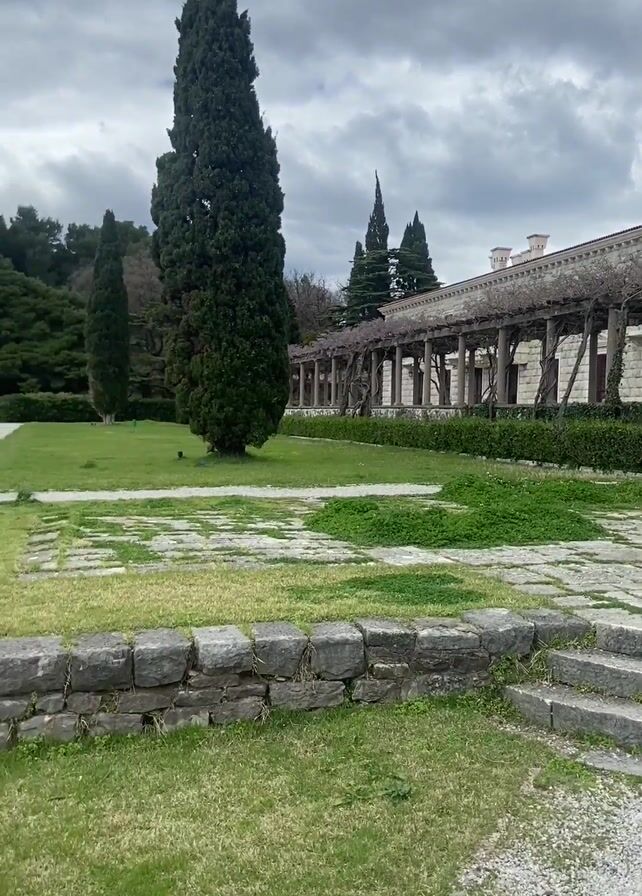 park with a building with a colonnade in the background. There are green lawns with stone pathways and low stone walls. The video pans to show people walking along a path near the sea. Some people are sitting on a wall overlooking the water. A small dog runs across the lawn. The sky is overcast with dark clouds.