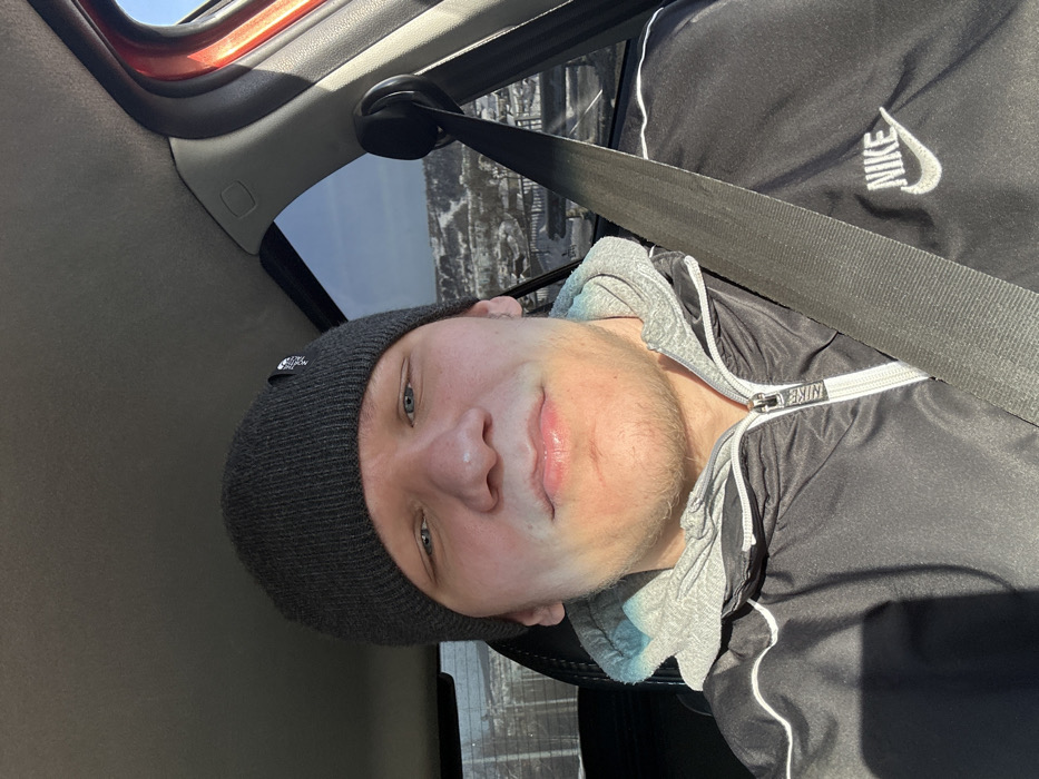 A male individual is depicted in a self-portrait taken inside a vehicle, located in Chusovoy, Russia