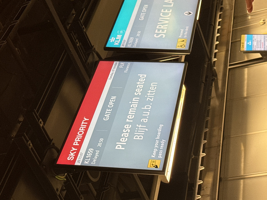 This image captures a close-up view of two overhead digital information displays within an airport terminal, specifically in Schiphol, Netherlands. The primary focus is the left screen, which prominently displays "SKY PRIORITY" in red against a light grey background. Below this, flight information indicates "20:15:07 KL1659 Delayed 20:50 GATE OPEN" along with "Tuesday, 07 October FLR Florence". The main instruction on this screen, in English and Dutch, reads "Please remain seated" and "Blijf a.u.b. zitten". A yellow icon at the bottom left features a person with a boarding pass and the text "Keep your boarding pass ready". To the right, a second, partially visible screen features a blue header with the KLM airline logo and identical flight information: "20:15:07 KL1659 Delayed 20:50 GATE OPEN". Below this, "SERVICE LA" is visible, and an accessibility icon with text "Proceed to the desk" is displayed. Both screens are suspended from a dark, exposed ceiling structure comprising metal beams and conduits. Below the screens, a reflective metallic wall or barrier is visible. A small blue sign labeled "Gate K?" is partially observable in the bottom right corner, where a human hand or arm is also partially visible, suggesting a person is present.