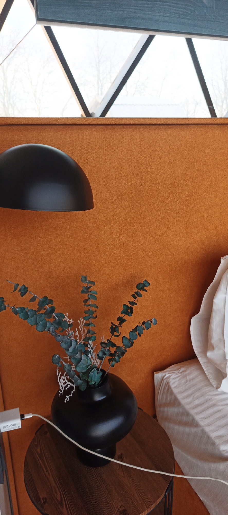 A close-up indoor shot features a black vase holding eucalyptus branches and decorative white sprigs, positioned on a round wooden side table with a dark brown finish. To the left above the vase is the curved black shade of a lamp. The background is a textured, orange-colored wall panel that goes up to a ceiling with triangular windows, allowing some bright sky to be seen. A white bed sheet and pillow are situated to the right of the vase, indicating this setup is near a bed. A white USB charger is plugged into a device. There's no indication of the location being in Iskateley, Russia; this information is not verifiable from the visual content of the image.