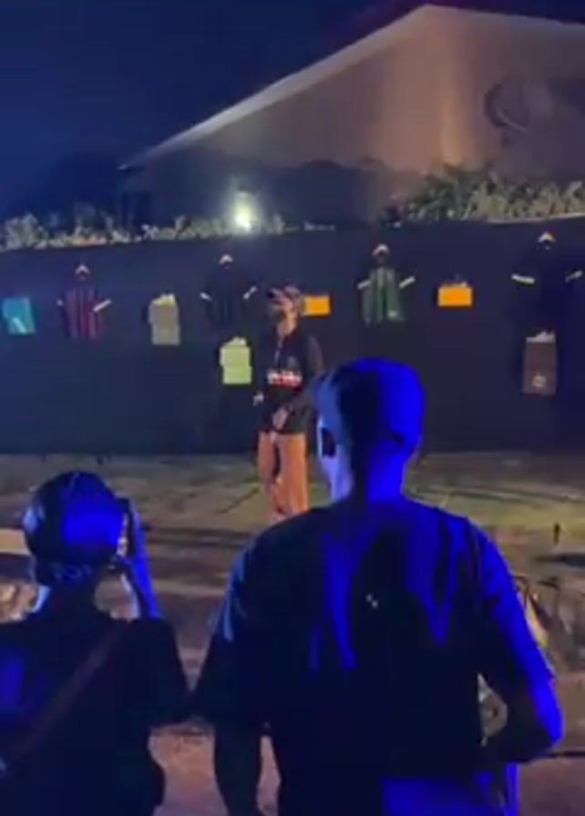A man is rapping on an outdoor stage illuminated with blue and green light, with several t-shirts hung on the wall behind him. He is wearing a dark shirt, brown pants, and white shoes. Two people stand in the foreground facing him, both wearing dark clothing and baseball caps. One of them is recording the performance on a phone. In the background, there is a low, light-colored building.