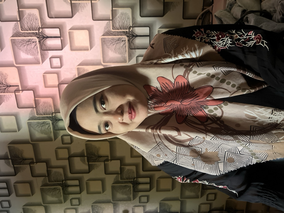 Location: Wedarijaksa, Indonesia. A single adult female, appearing to be of Southeast Asian descent, is depicted from the chest up, centered against a patterned wall. She wears a light beige hijab adorned with a prominent red-orange floral motif on the chest, supplemented by brown geometric and abstract patterns. Beneath the hijab, a dark inner head covering is visible. Her black long-sleeved garment features red floral embroidery on the right sleeve. She has dark eyes, a slight smile, and looks directly towards the viewer. The background wall is covered in wallpaper featuring a repeating pattern of interconnected rectangular and square outlines, each containing a dark silhouette of a tree. The wall's coloration transitions from a muted brown-yellow on the left to a pinkish hue on the right, indicative of varied lighting. A dark, indistinct object, possibly fabric or a piece of furniture, is partially visible in the lower right background.