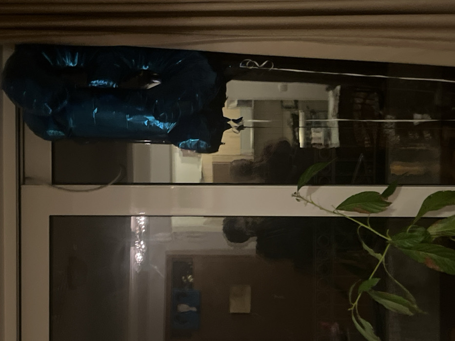 The image depicts an indoor scene in Podličak, Montenegro, observed through a glass sliding door or large window, likely during evening or night hours due to prominent reflections. In the immediate foreground, a green-leafed plant, approximately 30-40 cm in height, with some leaves showing brown discoloration, is positioned on the lower left. The central glass partition reflects interior elements: a distinct reflection of an individual with dark, curly hair, facing the viewer, is visible on the left panel, alongside a fainter reflection of another figure or object on the right panel. A reflection of a chandelier-style light fixture is also visible overhead on the glass. Through the glass, an interior room featuring light-colored cabinetry or shelving units is discernible. To the far right, a large, inflated, teal-blue foil balloon, shaped like the numeral '0' or a rounded 'O', is positioned against the window frame, with white ribbons hanging from its base. A light beige or brown curtain partially obscures the far right edge of the frame. The scene is static, with no active subjects or interactions.