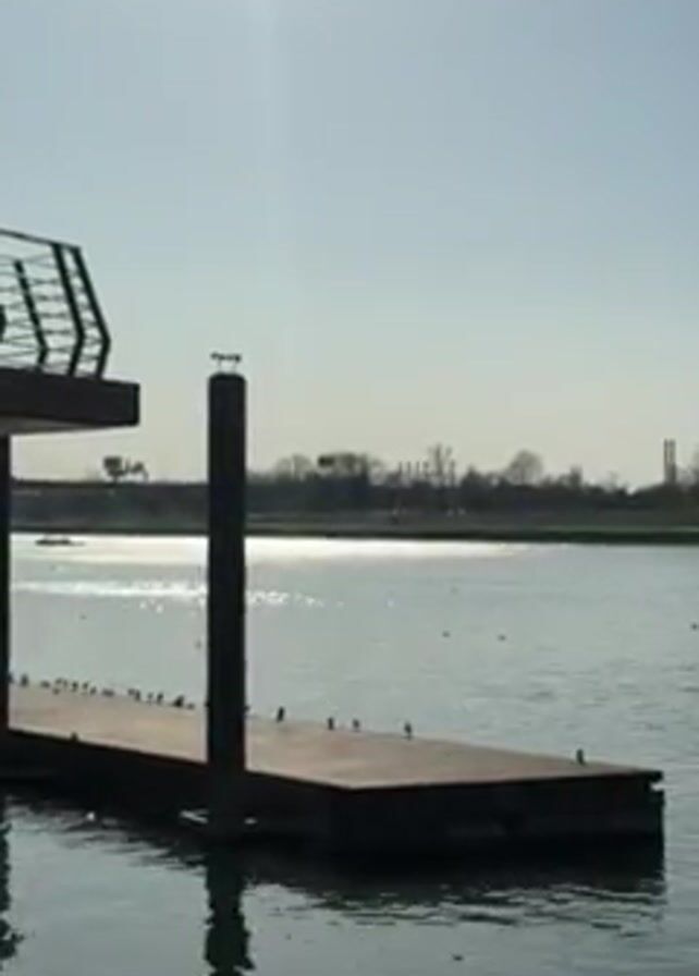 body of water, likely a lake, with a wooden dock extending into it. The sun is shining brightly, reflecting off the water's surface. There are birds resting on the dock. A modern structure with a green railing is visible on the left side of the frame. In the distance, trees and some industrial structures can be seen along the horizon. The sky is clear and blue.