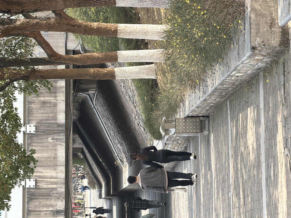 This image captures an outdoor pedestrian pathway in Jiangning District, China. In the midground, two individuals walk away from the viewer, holding hands. The person on the left wears a light grey jacket, dark pants, and white sneakers, carrying a white shoulder bag. The person on the right wears a dark long-sleeved top and dark pants, with white sneakers and hair tied in a ponytail. They traverse a light-colored paved pathway, which shows distinct shadows from an unseen overhead structure or foliage. To the right of the pathway, a low wall composed of reddish-brown bricks with grey capping stones borders an elevated area. A silver-colored, perforated rectangular garbage bin is situated on the pathway adjacent to this wall. The elevated area features several trees with reddish-brown bark, the lower sections of their trunks painted white, interspersed with green bushes displaying small yellow flowers. In the background, a substantial grey concrete overpass spans across the scene. Beneath the overpass, sloped, textured concrete walls form a passage, with a dark pipe running horizontally along one of these sloped surfaces. Beyond this underpass, additional human figures are discernible on a separate, higher pathway, including one person on what appears to be a light blue scooter.