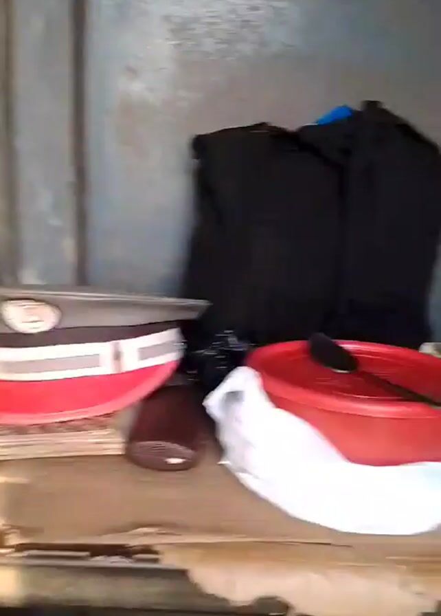 A person wearing a light grey shirt, dark pants with a red stripe, and a grey and white striped belt walks towards the camera. The person has their hair in a bun and is wearing earrings. The video appears to be taken from inside a small space with miscellaneous items on a surface, including a water bottle, a red cloth, and a black object. The lighting is uneven, with bright light coming in from an opening.
