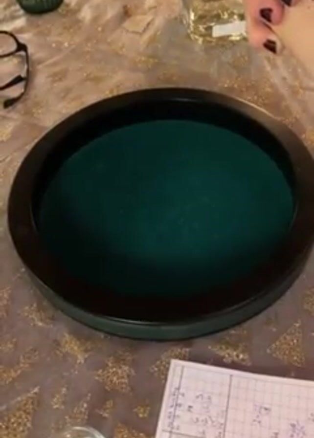 A hand shakes five dice in a light brown cup, then drops them into a round, green-felt-lined dice tray with a dark brown rim