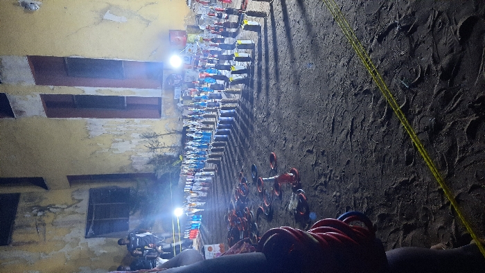 A dimly lit alleyway features a weathered building with barred windows. A string of lights illuminate the scene, casting shadows on a textured ground. Merchandise is displayed along the alley, including what appears to be scooters and other items for sale. A yellow rope runs diagonally across the ground, adding to the cluttered atmosphere.