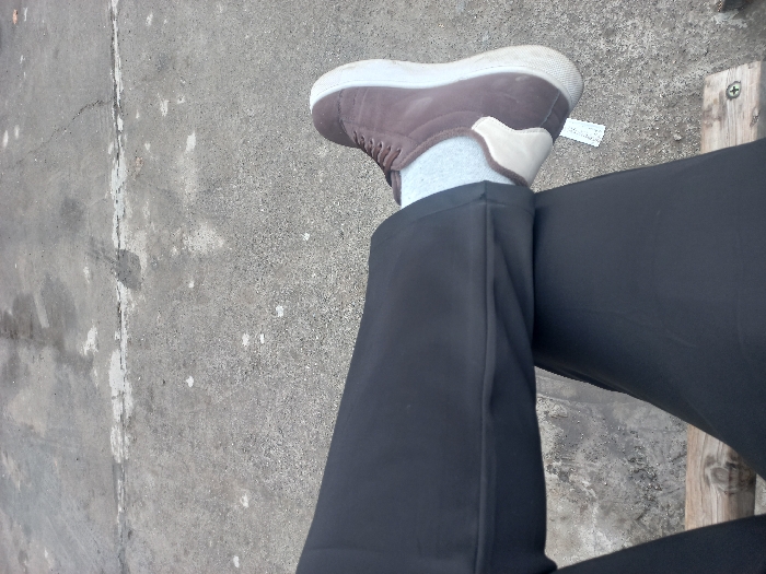 The image depicts a first-person, downward view of a person's lower body in Fergana City, Uzbekistan. The subject is seated, wearing dark-colored trousers on both legs. The right leg, visible on the left side of the frame, is elevated, showcasing a brown low-top sneaker with a white sole and a beige heel accent. Light grey socks are visible between the pant cuff and the shoe. The left leg is partially obscured but also wears dark trousers. A wooden surface, likely part of a bench, is visible beneath the legs, with a screw head observed on its surface. The ground beyond the subject's feet is a grey, textured concrete or asphalt surface displaying wear, cracks, and varied discoloration. A small, light-colored rectangular object, possibly paper or a tag, lies on the ground near the right shoe.