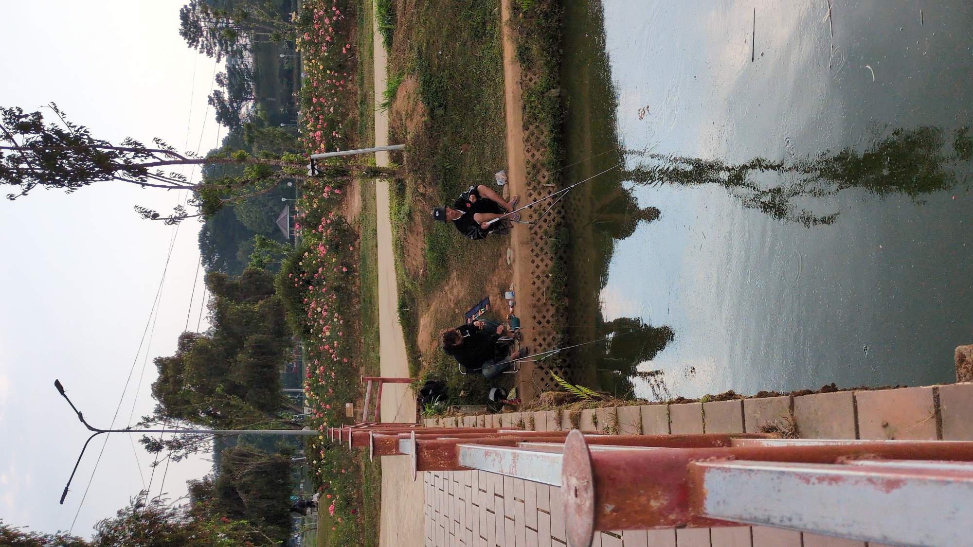 two people fishing by a lake in Lam Vien - Da Lat, Vietnam. The location has a brick pathway with a red and white railing. Beyond the path is a grassy area with flowers next to a dirt bank that slopes down to the water's edge. The two individuals are seated on the dirt bank, each holding a fishing rod that extends over the water. Their reflections are visible in the lake. A dirt path runs parallel behind the fishing individuals. Trees and street lights are situated along the pathway.