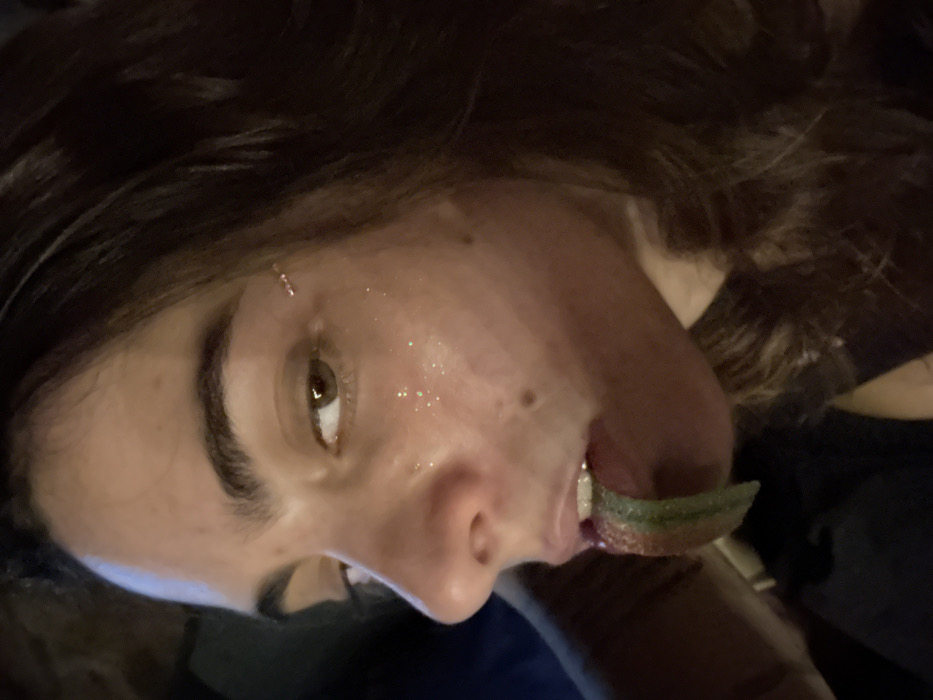 A close-up image depicts a female individual in the city of Ban Mae Ping, Thailand. Her face, oriented in a partial left profile, features brown eyes, dark eyebrows, and brown, wavy hair. Small, iridescent glitter particles are visible on her left cheek and below her left eye. A thin, horizontal, metallic-appearing decorative piece is positioned near her left temple, above the eyebrow. Her mouth is slightly agape, revealing a multi-colored gummy candy, primarily green and red, protruding horizontally from between her lips and resting on her tongue. She is wearing a dark-colored garment. The background is uniformly dark and out of focus, indicating a low-light environment.