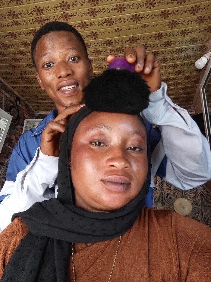 This indoor image, set in Ila Orangun, Nigeria, displays two individuals. In the foreground, a female with dark skin looks directly at the camera, exhibiting a neutral expression with slightly parted lips. She wears a black patterned headscarf, a brown garment, and a thin gold-colored necklace; her cheeks show a reddish hue. Behind her and slightly to the right, a male with dark skin smiles broadly, revealing his teeth. He wears a blue and white collared shirt. The male's right hand holds a black, spherical, textured hair accessory above the female's head, while his left hand is positioned near her left temple. The background features a brown and gold floral-patterned ceiling. To the left, a dark textured wall and a partial view of a reflective surface, possibly a mirror, are visible. In the lower right background, a light-colored standing fan with a circular cage is present, and a white tubular light bulb is partially visible in the upper right.