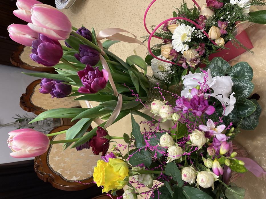The scene, located in the city of Aratashen, Armenia, depicts multiple floral arrangements displayed on a light-colored, polished table surface