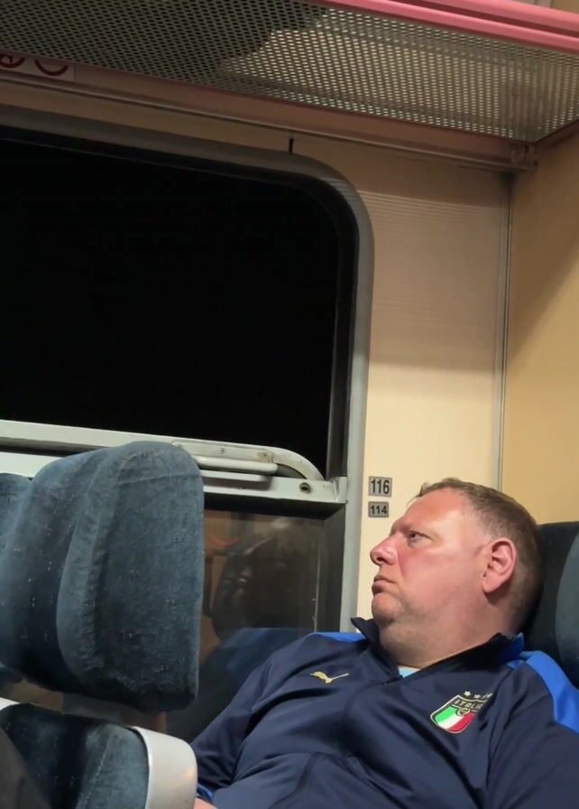 A man in an Italian national soccer team track suit sits on a train