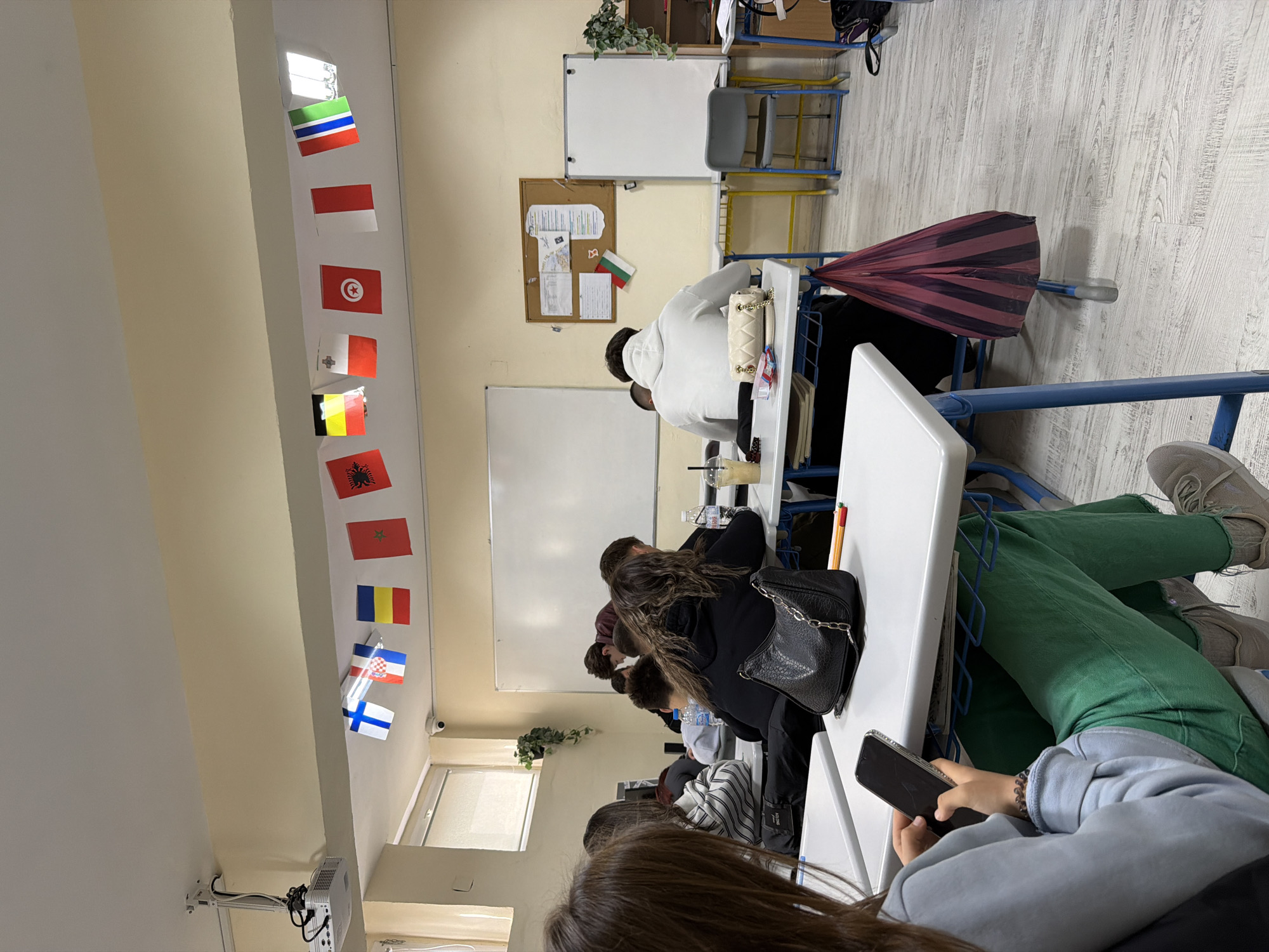 The image depicts an indoor classroom located in Goce Delcev, Bulgaria